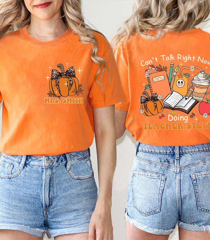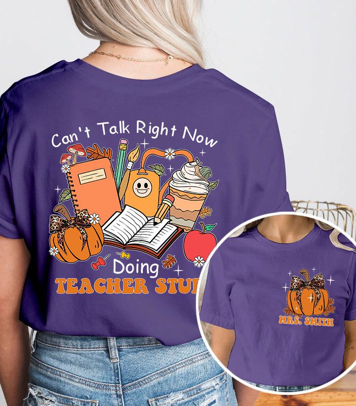 Be the first to review “Personalized Autumn Pumpkin Can’t Talk Right Now Doing Teacher Stuff Teacher Two Sided T-Shirt” Cancel reply