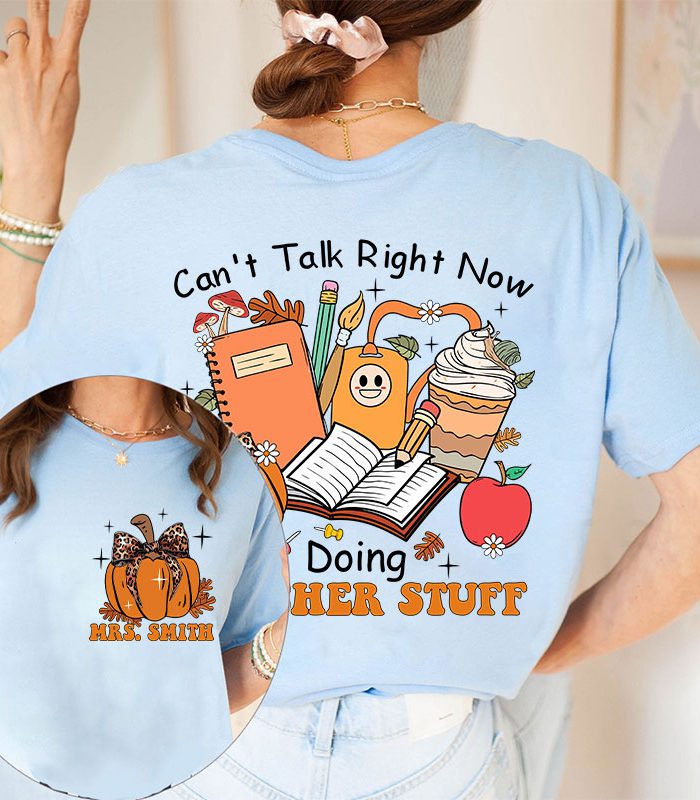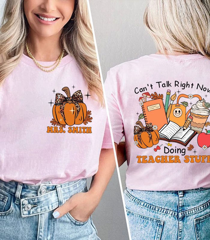 Be the first to review “Personalized Autumn Pumpkin Can’t Talk Right Now Doing Teacher Stuff Teacher Two Sided T-Shirt” Cancel reply