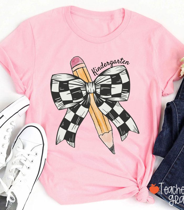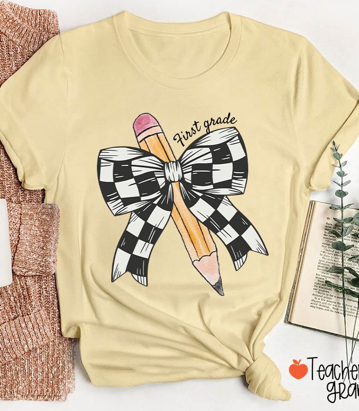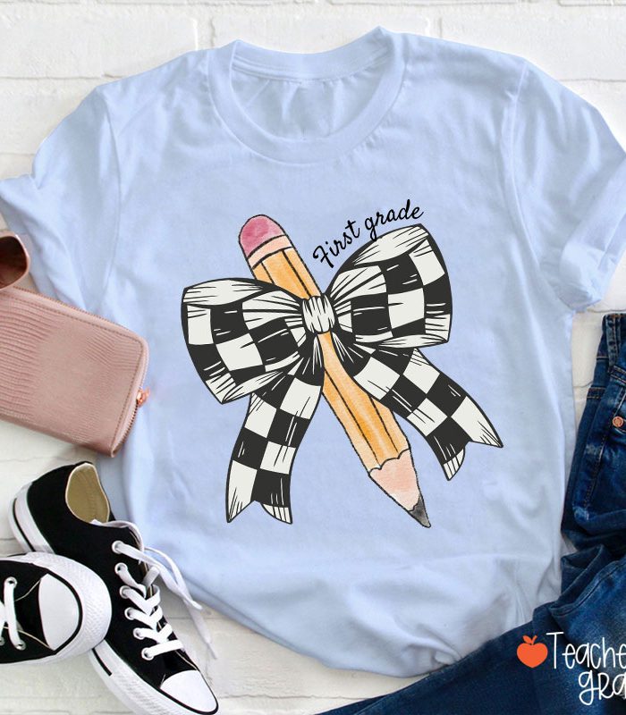 Personalized Grade Checkered Bow Pencil Teacher T-Shirt