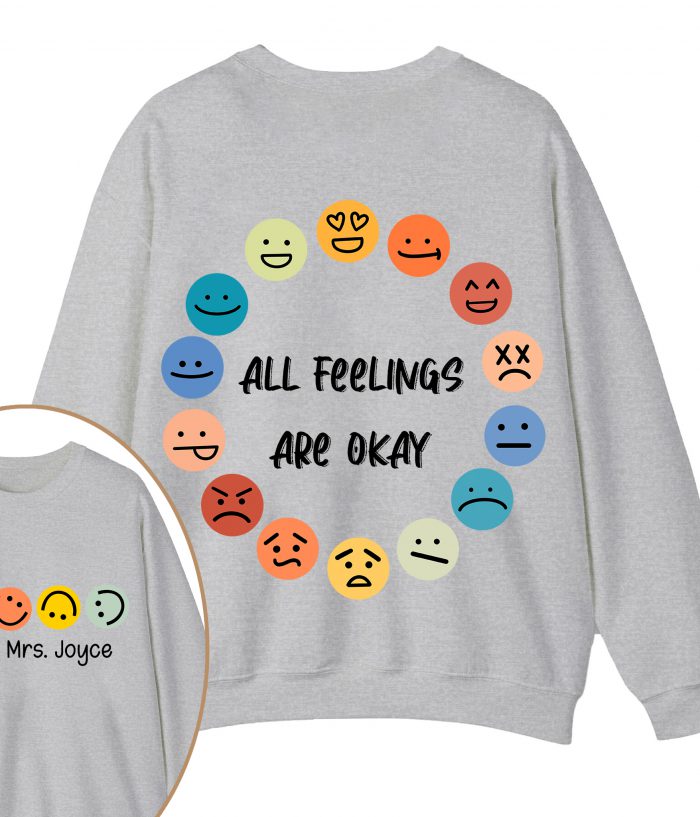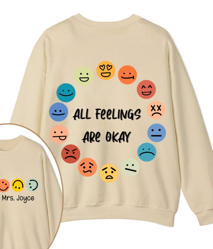 Be the first to review “Personalized Name All Feelings Are Okay Teacher Two Sided Sweatshirt” Cancel reply